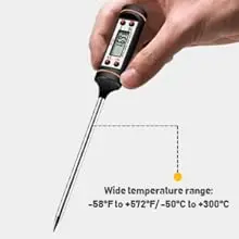 Comes with an instant read thermometer to prevent one from over-cooking their meat. Wide temperature range: -58°F to +572°F/ -50°C