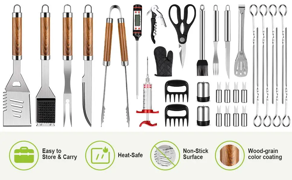 • Complete Grilling Toolkit: Tongs, spatula, fork, basting brush, skewers, cleaning brush, non-stick aluminum mats, and a handheld thermometer — all the new BBQ accessories you need in one set.