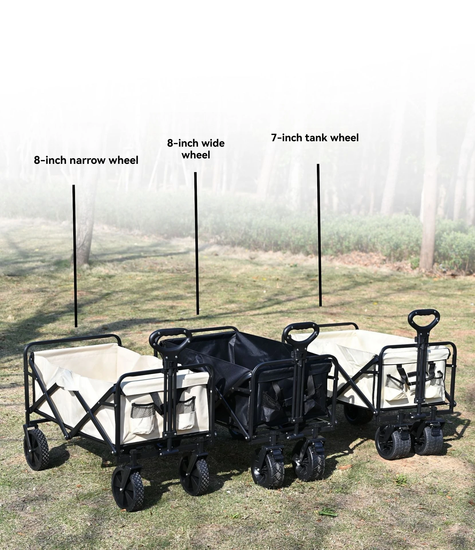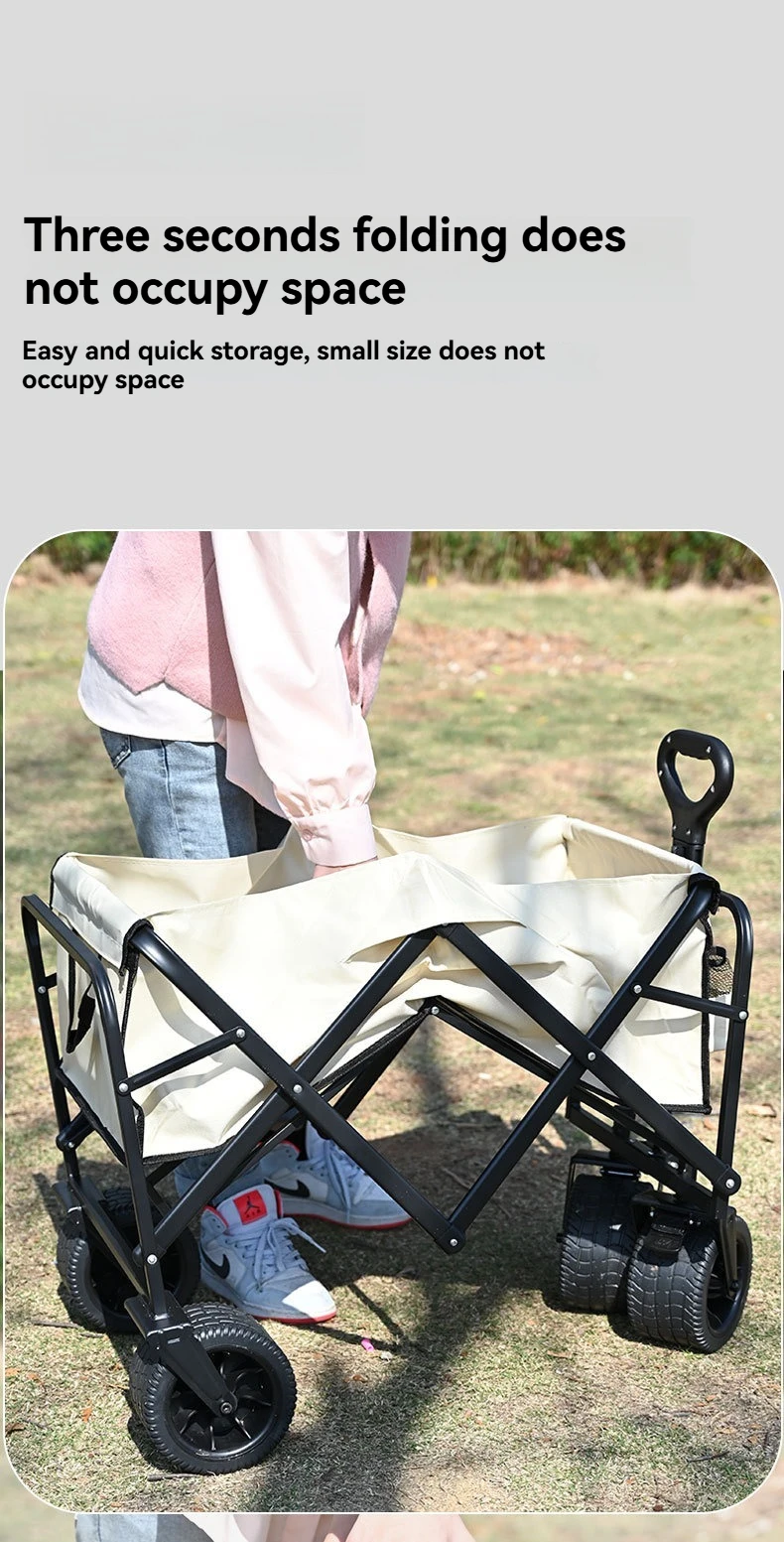 One of the main advantages of this foldable camping wagon is its compact, collapsible design. In just seconds, it folds down to a small, portable size, making it easy to store in your car trunk, garage, or even a closet. The lightweight yet strong frame ensures portability without compromising durability, so you can take it anywhere without hassle.
