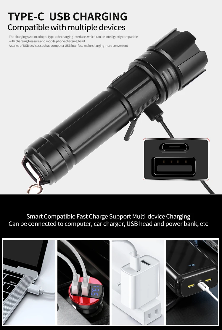 Unlike traditional battery-powered torches, LED rechargeable flashlights save you money and time by eliminating the constant need to replace disposable batteries. Equipped with high-capacity lithium batteries, they can be recharged via USB, solar panels, or wall chargers—making them eco-friendly and cost-efficient. Thanks to advanced power management, you can enjoy hours of continuous use on a single charge, ensuring your light never fails when you need it most.