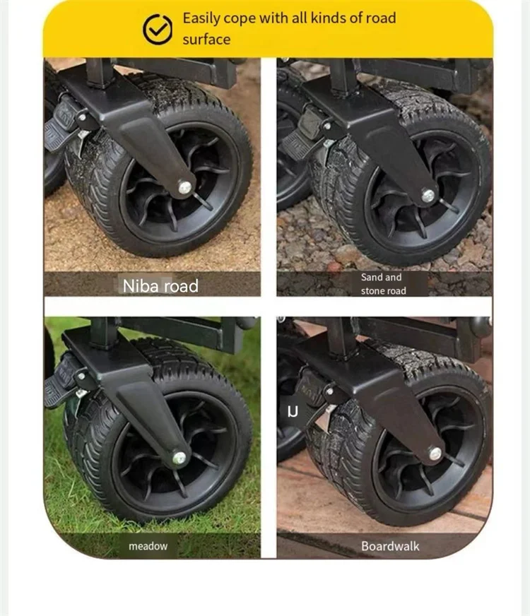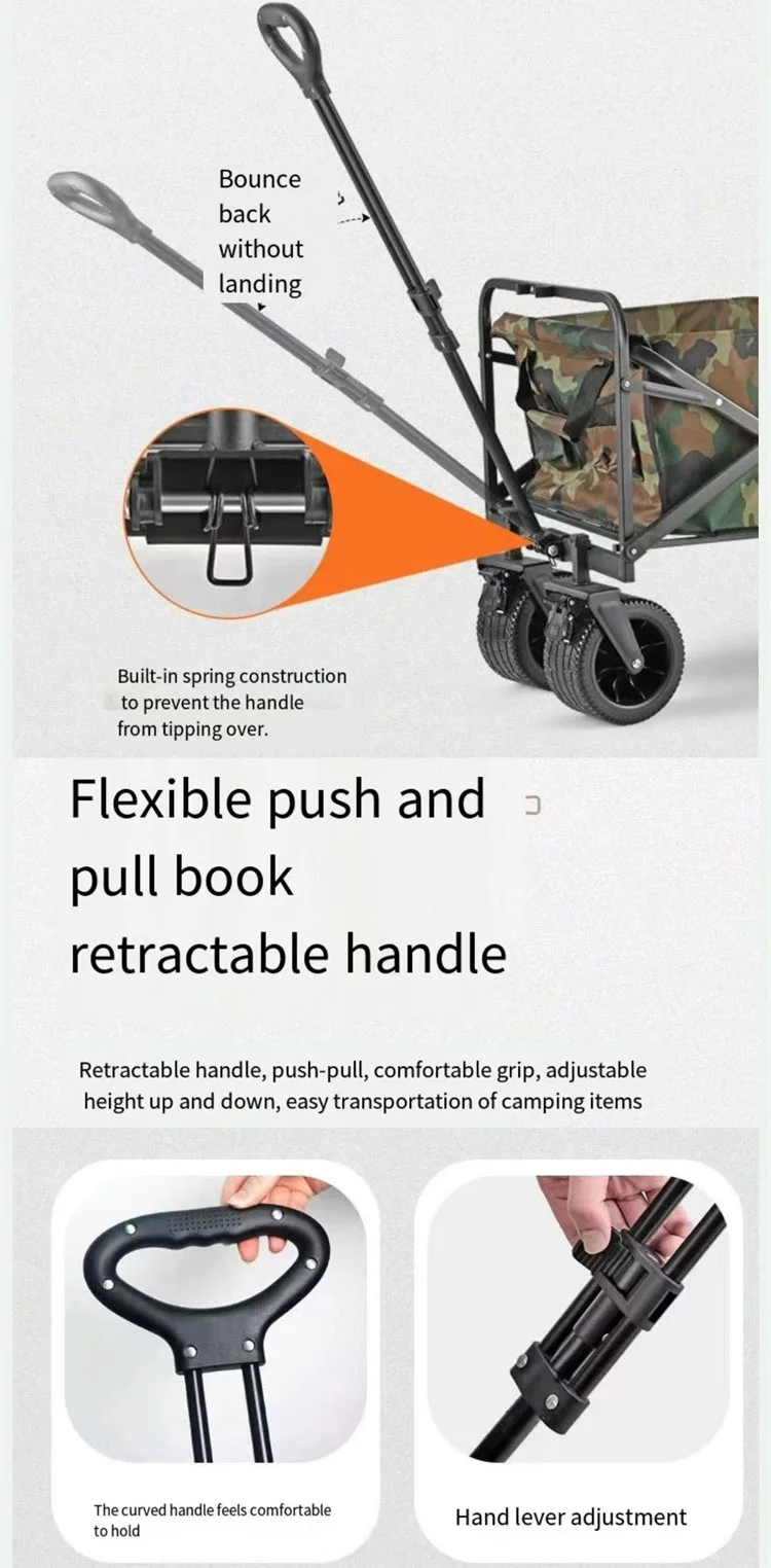 Equipped with oversized, 360° swivel all-terrain wheels, the Portable Folding Wagon glides easily across various surfaces, from sandy beaches and grassy parks to gravel paths and paved roads. The heavy-duty tires provide excellent traction and shock absorption, ensuring smooth maneuverability even when fully loaded. The adjustable telescopic handle offers a comfortable grip and allows effortless steering for users of different heights.